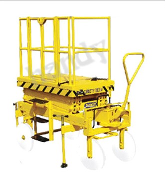 This is a mobile type table with all the features above described, but is mobile on four wheels, two of which will be fixed and two front wheels steering type. This is a more versatile model which can move around the workshop and work anywhere. This can also be supplied in the two versions as above described i.e. the operation on the top platform, raising and lowering the table there from and the operator handling the table from the floor.
