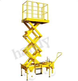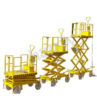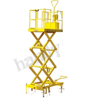 This is a mobile type table with all the features above described, but is mobile on four wheels, two of which will be fixed and two front wheels steering type. This is a more versatile model which can move around the workshop and work anywhere. This can also be supplied in the two versions as above described i.e. the operation on the top platform, raising and lowering the table there from and the operator handling the table from the floor.