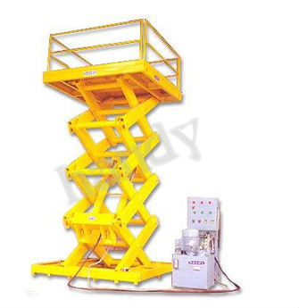"Handy" Powered Hydraulic Highlift Scissor Platforms are reaching up to a height of 12 Mtr. This is used in places, Where very high equipments are installed or material/items have to be shifted from ground floor to first floor/second floor. This type of Scissor Lifting Platforms can be fixed in a pit, so that the top of platform will be flush with the shop floor in order that a mobile trolley can be loaded directly on the platform.
