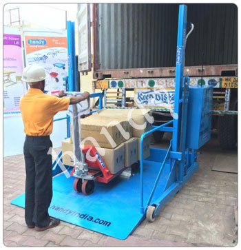 This “Handy” Mobile Truck Loader is very useful machine to load, Unload the material, Paper reels , boxes, Drums, small machines , items on pallets, from the all type of trucks / containers in plants , warehouses, Godowns etc.
